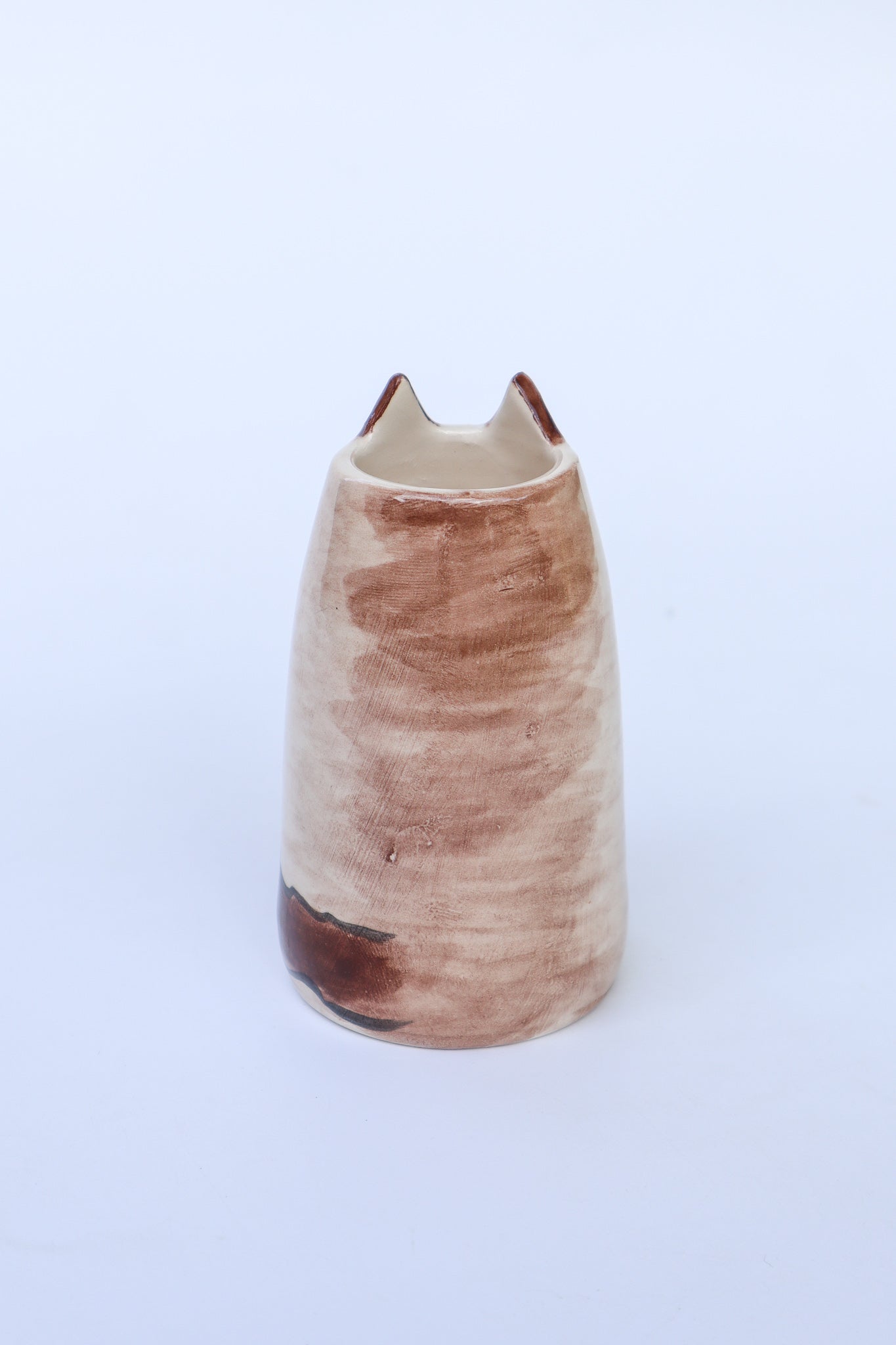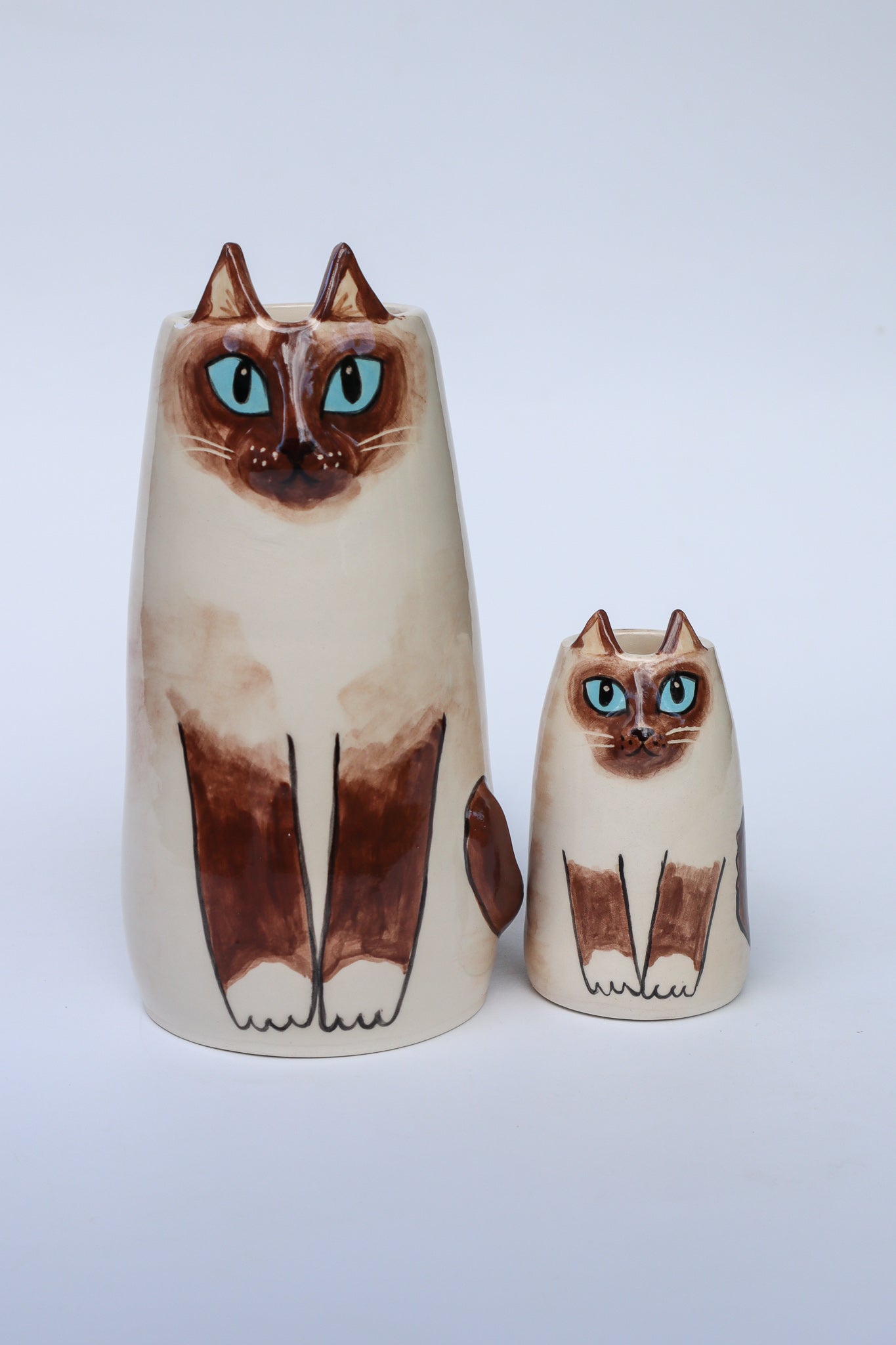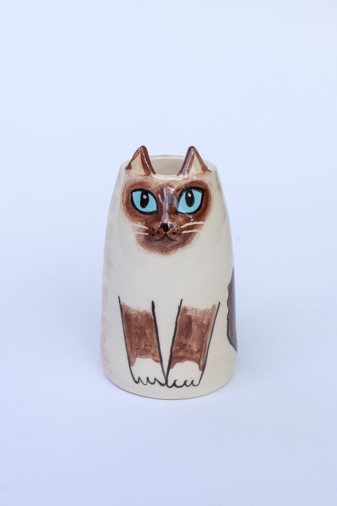 The vase shape is thrown on the potters wheel in earthenware clay. I then trim, and alter the vase once it's leather-hard, adding ears and little face. The cat is then brought to life as I carefully illustrate its features by hand, giving each vase it's unique personality. The vase is then fired, glazed and fired again.